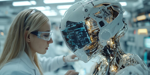 female engineer examines humanoid robot in futuristic lab, showcasing advanced technology and innovation. scene highlights intersection of human creativity and artificial intelligence
