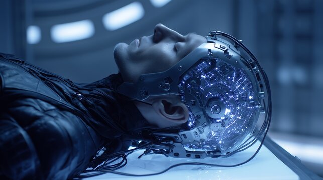 A person equipped with advanced neural technology, highlighting the integration of human and machine in a futuristic setting.