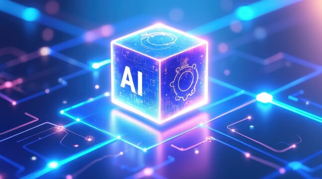 A vibrant digital cube highlighting the concept of artificial intelligence, surrounded by glowing circuitry and futuristic elements.