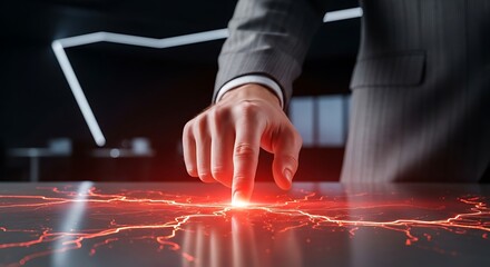 A businessman s hand interacts with a futuristic holographic display creating a vibrant energy and light effect