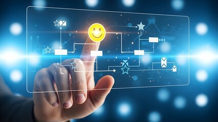 Hand interacting with a futuristic holographic interface displaying a flowchart or decision tree, symbolizing technology and innovation