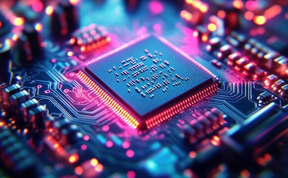 Graphic Rendering of Abstract Technology Background Highlighting CPU and Neon-lit Futuristic Motherboard
