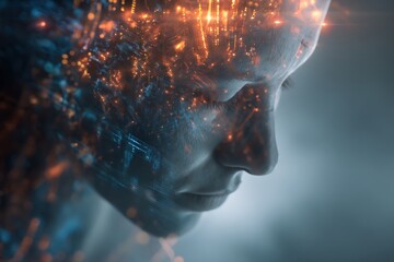 Image of a person with closed eyes overlayed with layers of data and AI network circuits.