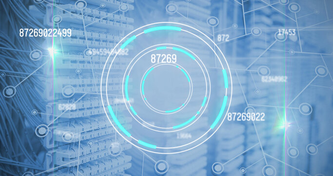 Multiple changing numbers over round scanner and network of connections against server room