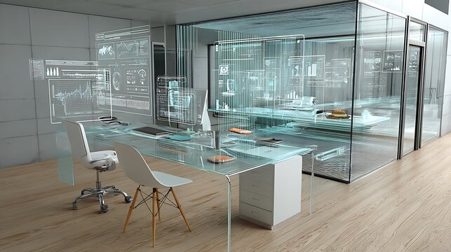 Modern Glass Office Desk with Futuristic Holographic Projections Showing Data and Charts
