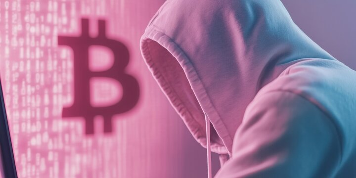 Man in hoodie with Bitcoin symbol overlay coding on computer in digital environment, fluorescent neon pink colors. Concept of cybersecurity and data protection, cryptocurrency. Futuristic banner