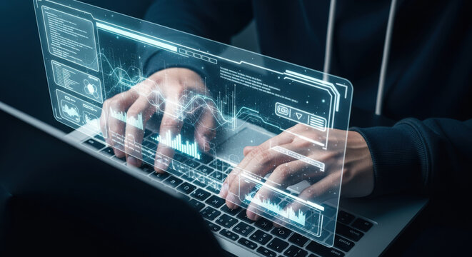 Navigating the Digital Frontier A Hacker's Hands on Keyboard with Futuristic Interface Overlay for Data Analysis and Cybersecurity Threat Detection in Dark Environment