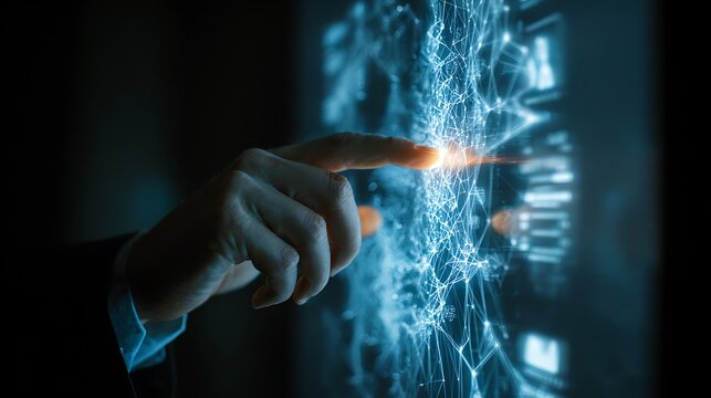 Human finger interacting with futuristic blue digital interface displaying complex data streams