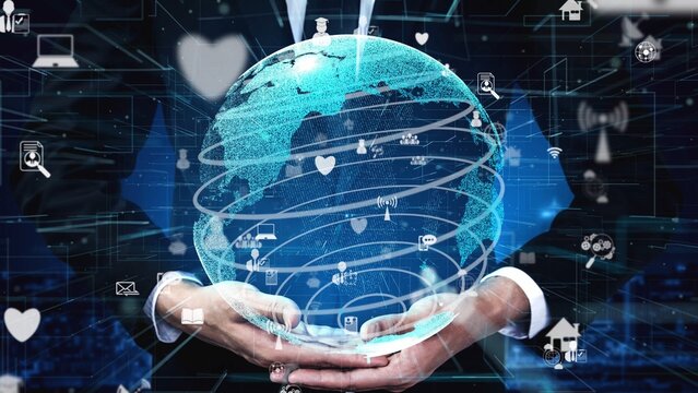 A businessman in a suit holds a digital globe showcasing various network icons, emphasizing global connectivity, technology, and modern communication trends. Xenic