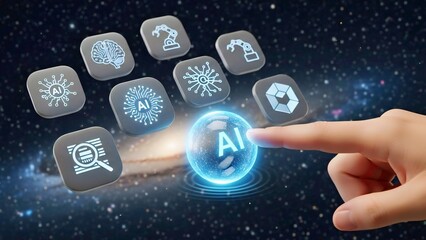 Minimal 3D AI Dashboard UI with Glowing Icons and Human Finger Selecting Digital Elements
