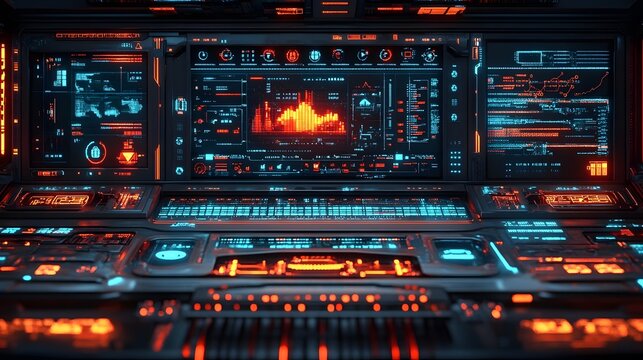 Futuristic control panel with glowing interfaces and data displays.