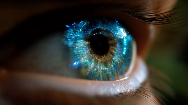 A close-up of a human eye enhanced with digital technology, featuring blue hues and futuristic graphics, symbolizing advanced vision and innovation.