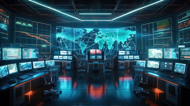 Futuristic Cyber Security Command Center: Advanced Technology and Data Visualization