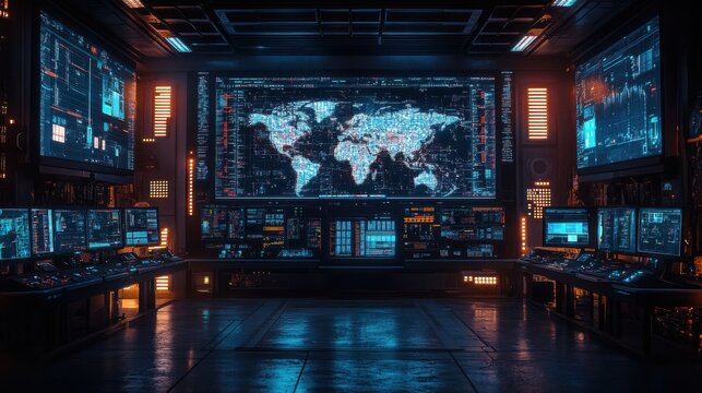 A futuristic control room displays numerous screens showing global maps, data streams, and system controls. Illuminated in blue and orange, it suggests advanced technology and monitoring capabilities.