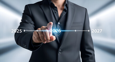 Businessman Interacting with Futuristic Timeline Interface Highlighting Year 2026.