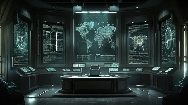 Futuristic surveillance command center.  Modern control room with multiple screens displaying global network maps, data streams, and security information.  Dark, sophisticated aesthetic