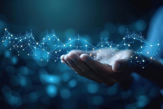 Abstract digital businessman hands-holding growth chart in futuristic style. Business partnership and teamwork concept. Low poly wireframe vector illustration on technology blue background
