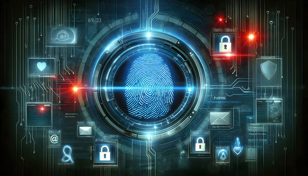 Hacker A glowing fingerprint scanner with phishing links and email alerts hovering around it, set in a high2