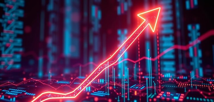 Abstract glowing arrow rising on technological background, data streams visualizing financial growth,   circuit,   screen