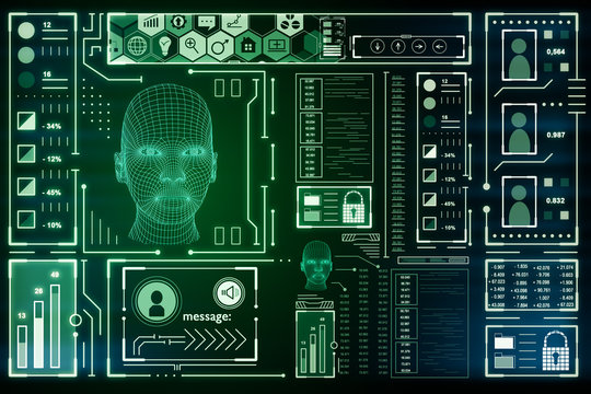 Green digital HUD interface with concentric rings and technological elements on a dark background. Futuristic Digital Technology Background .Artificial Intelligence Data Flow Background.