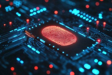 Futuristic digital fingerprint scanner on a microchip, glowing blue biometric security technology, symbolizing cybersecurity, encryption, and identity verification.