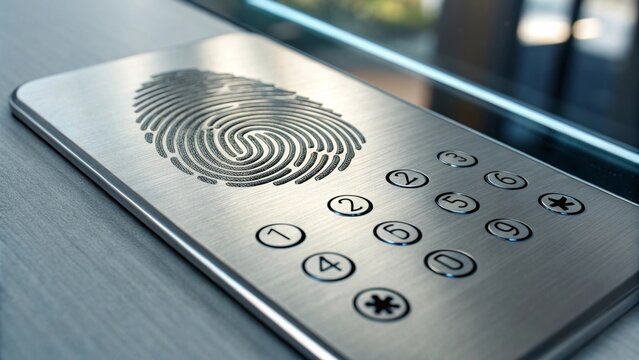 Fingerprint Security Macro Shot of a Metallic Surface with Fingerprint Scanner & Numeric Buttons for Enhanced Biometric Identification
