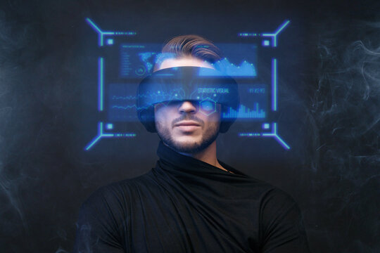 Man engaging with futuristic interface and digital icons