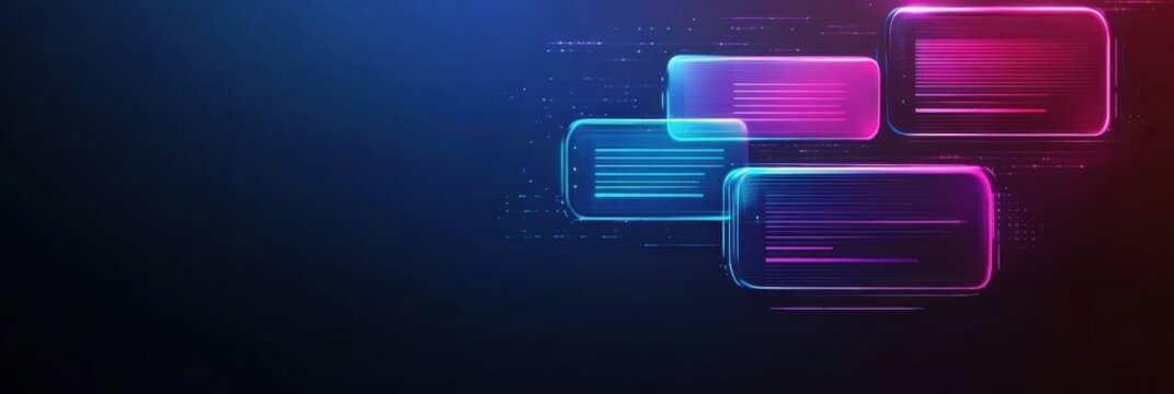 Floating message bubbles illuminate a chat interface with glowing notifications in a digital space at night. Generative AI