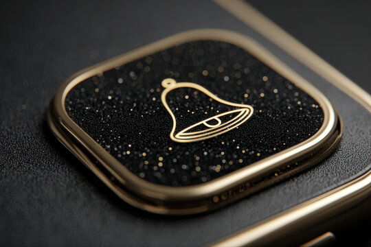 Golden bell notification icon with floating particles and smartphone silhouette on dark background