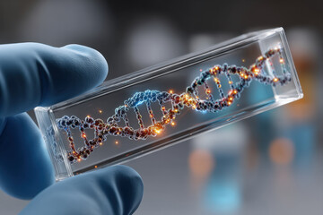 AI generated futuristic concept of genetic and molecular research showing gloved hand tool DNA structures and glowing data center in blue and gold tones
