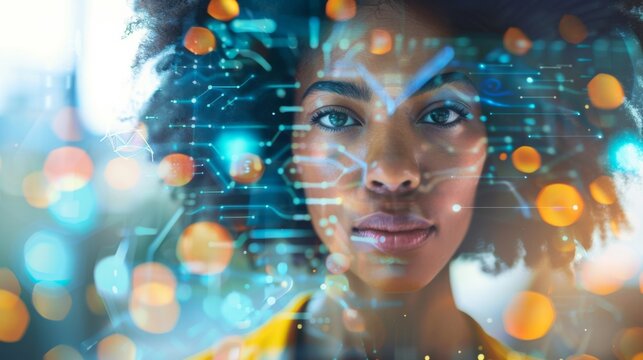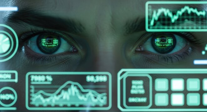 Cyber Vision: A close-up of human eyes reflecting a futuristic digital interface, symbolizing technological prowess and insightful vision.