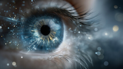 Close up of an eye gazing at futuristic data insightful glance technological interface detailed