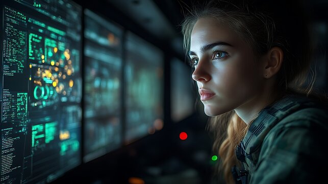 Focused woman monitoring digital data on large screens.