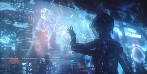 Scientist interacting with futuristic interface analyzing data from space exploration mission