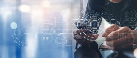 Computer programmer analyzing software coding and development, information on futuristic virtual interface, software engineering, data scientist. Deep learning of artificial intelligence