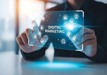 Digital marketing strategy concept with futuristic interface and business professional interaction