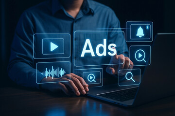 A businessman interacts with a digital tablet displaying various advertising icons and social media symbols, set against a vibrant blue urban background. Tessel