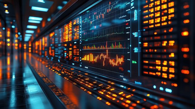 Futuristic data center with illuminated screens displaying analytics and graphs at night