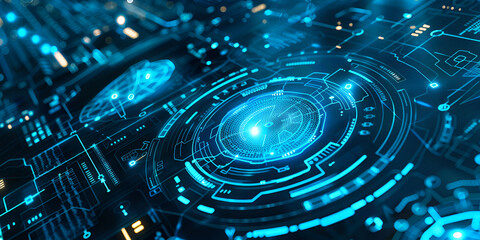 Futuristic Digital Interface Display with High-Tech Data Visualization, Abstract Cyber Technology Background with Holographic Interface Elements, A blue circle with a bright light in the center