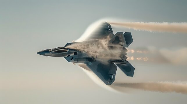Stealth fighter jet breaking the sound barrier. Supersonic aircraft creating shockwaves. Concept of military aviation, aerospace technology, high-speed flight