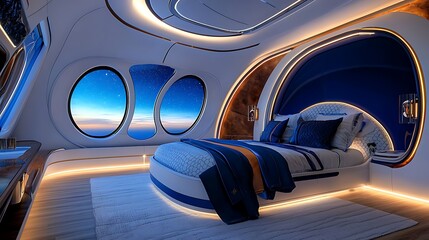 A private jet�s futuristic design includes a cozy bed and a starry night view, blending style with comfort.