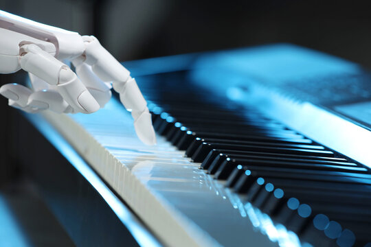 Artificial intelligence. Robot hand playing piano on dark background, closeup