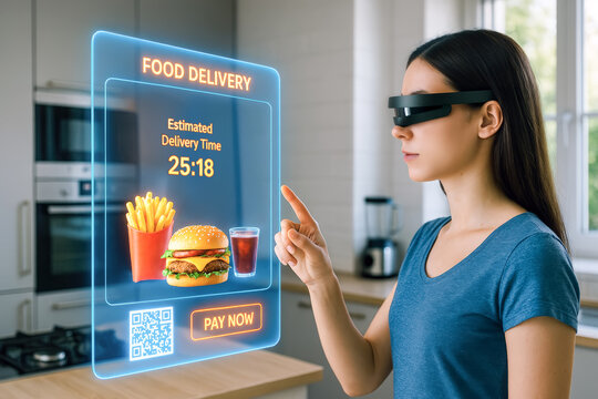Young woman interacts with futuristic augmented reality interface to order fast food online, including burger, fries, and soda.