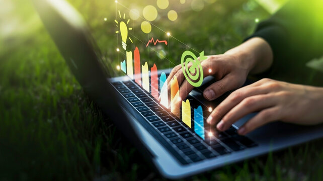 A digital illustration of a business analytics interface overlaid on a laptop workspace
