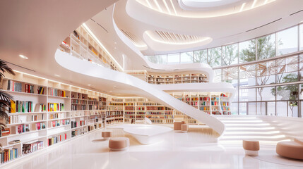 Futuristic library interior with modern bookcases