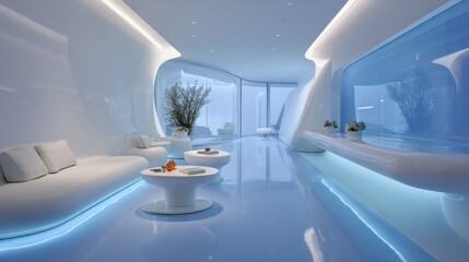 Modern interior design featuring sleek white furniture, illuminated surfaces, and minimalist decor, creating a serene and futuristic atmosphere in a spacious lounge area