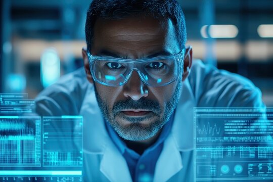 Focused Male Scientist Analyzing Data on Holographic Interface