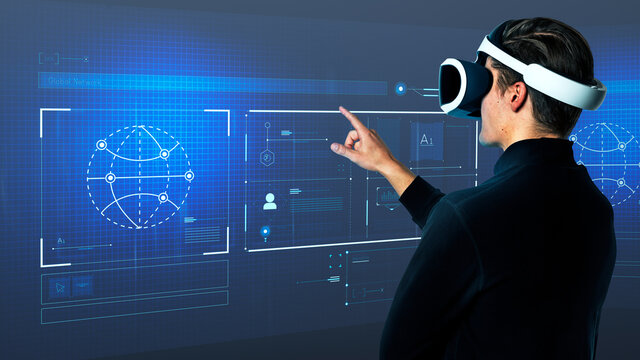 Futuristic Man In Vr Goggles Analyzing Digital Data Interface Images