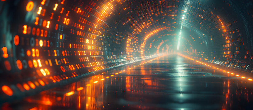 Abstract digital tunnel with red binary code patterns converging toward a bright light, representing data flow, technology, and cyber space concepts.