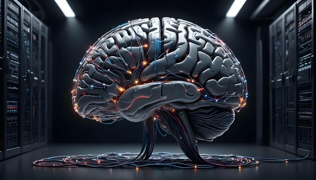 human brain is intricately connected with glowing wires and technological interfaces, suggesting concepts of artificial intelligence